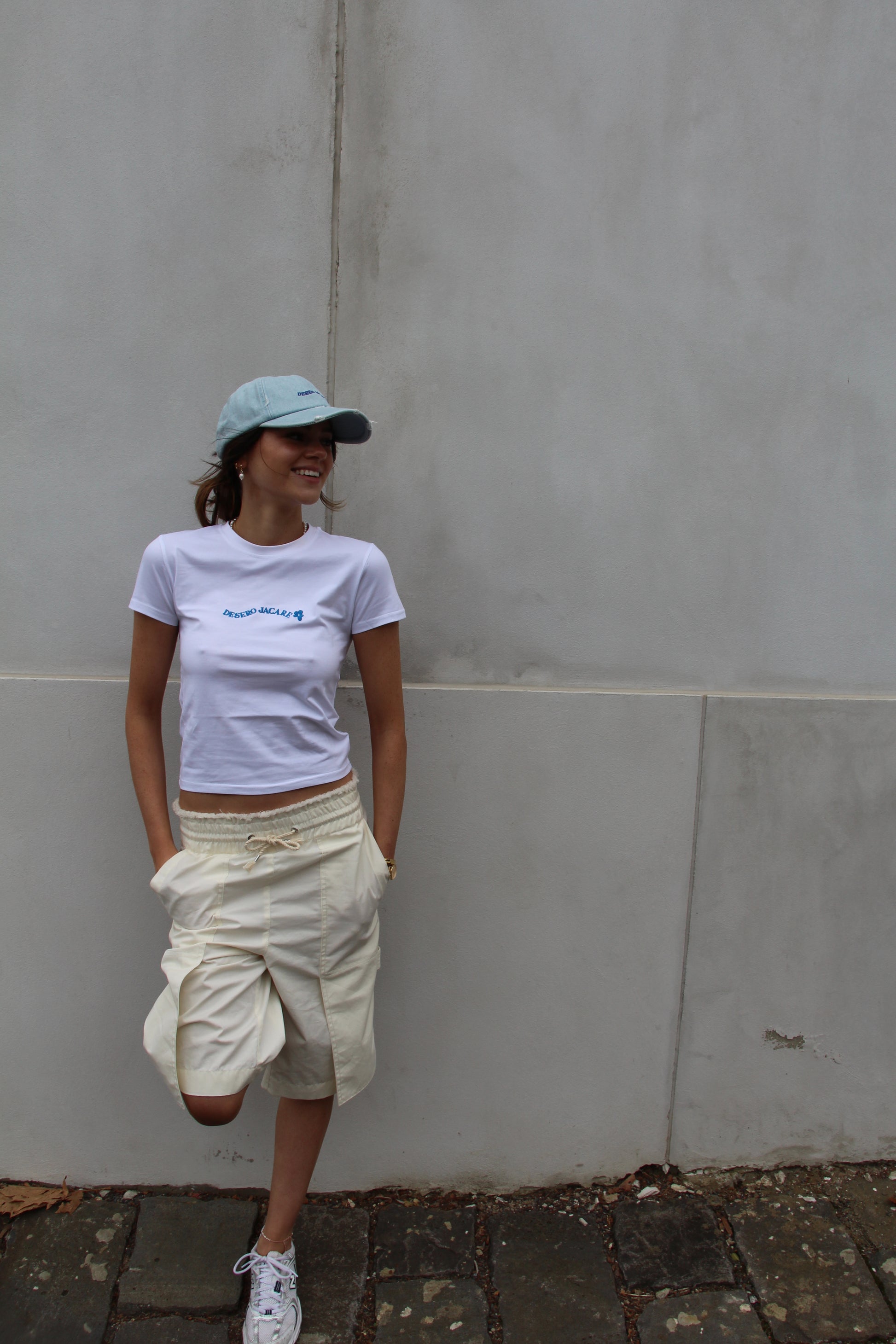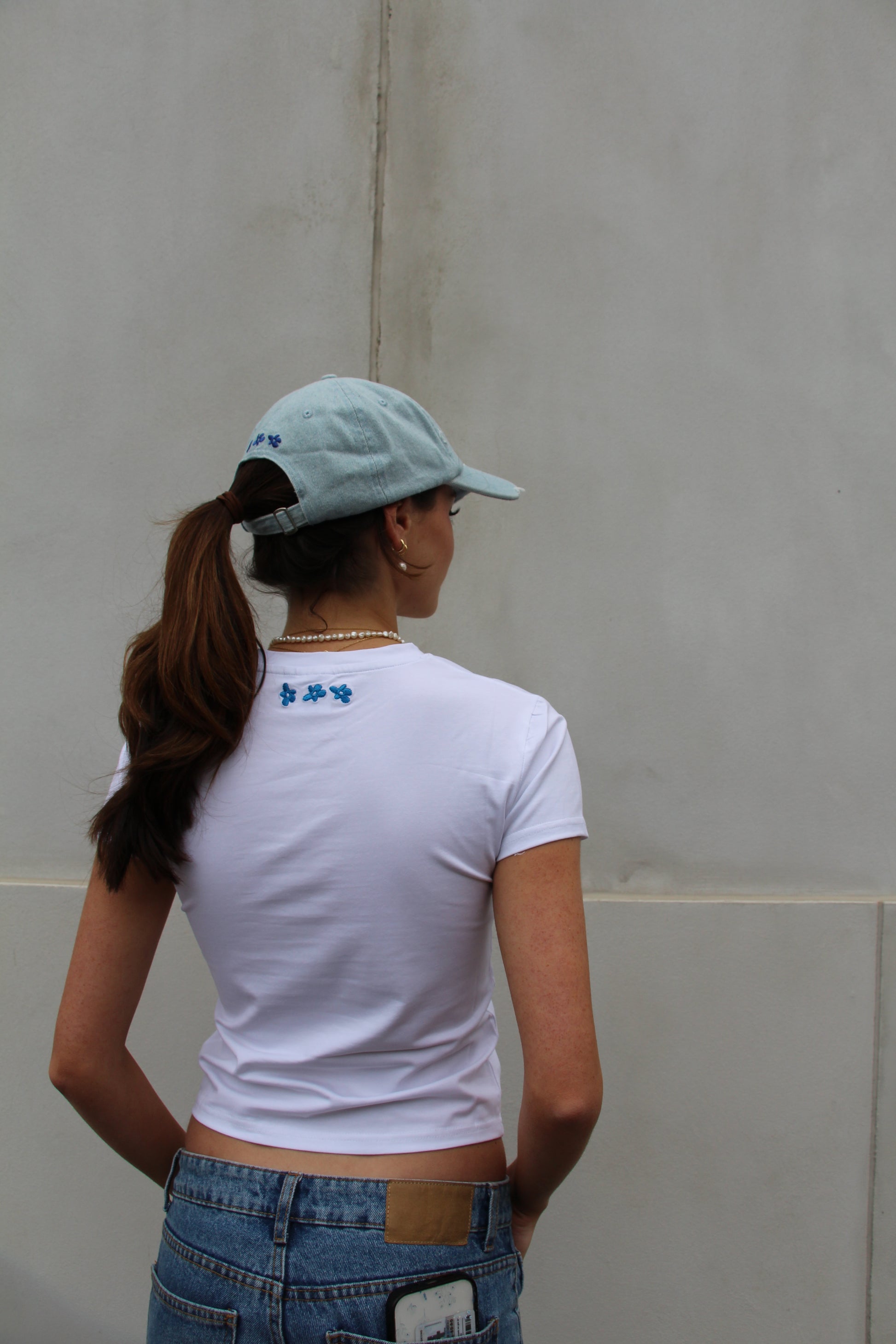 HOT TIP: White fitted tee matches the front and back of the cap for a complete look.
