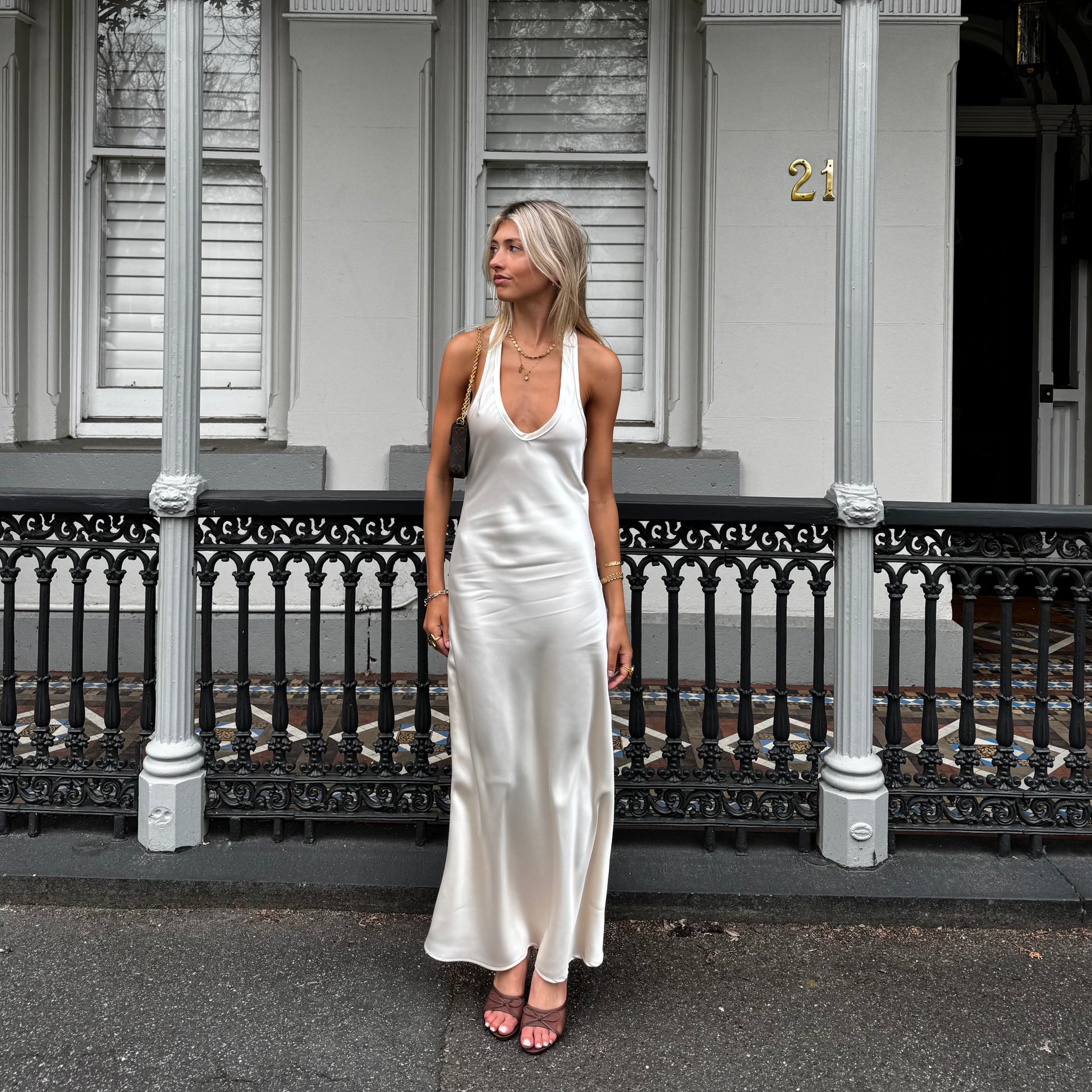 A maxi dress designed with a detachable scarf, made to move with you. A piece inspired by Rome - defined by versatility, minimal design, and timeless femininity.