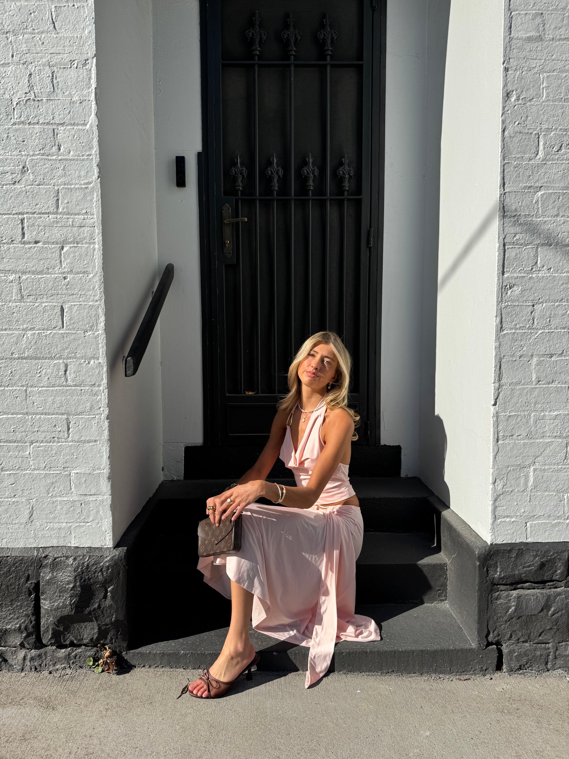 A pale pink colour with matte gold hardware and a wrap tie - Inspired by the Italian wine region Siena. The perfect set for those special occasions, holidays, going to a winery with a spritz in hand