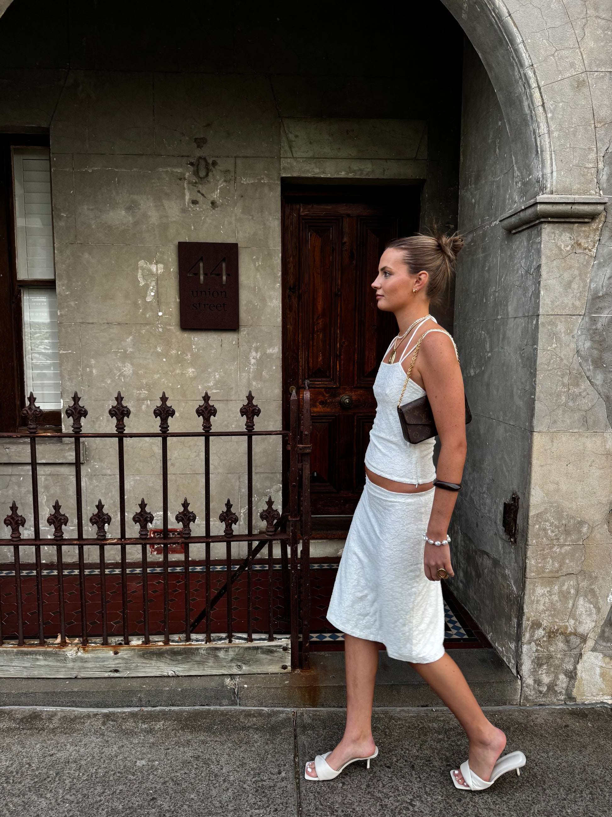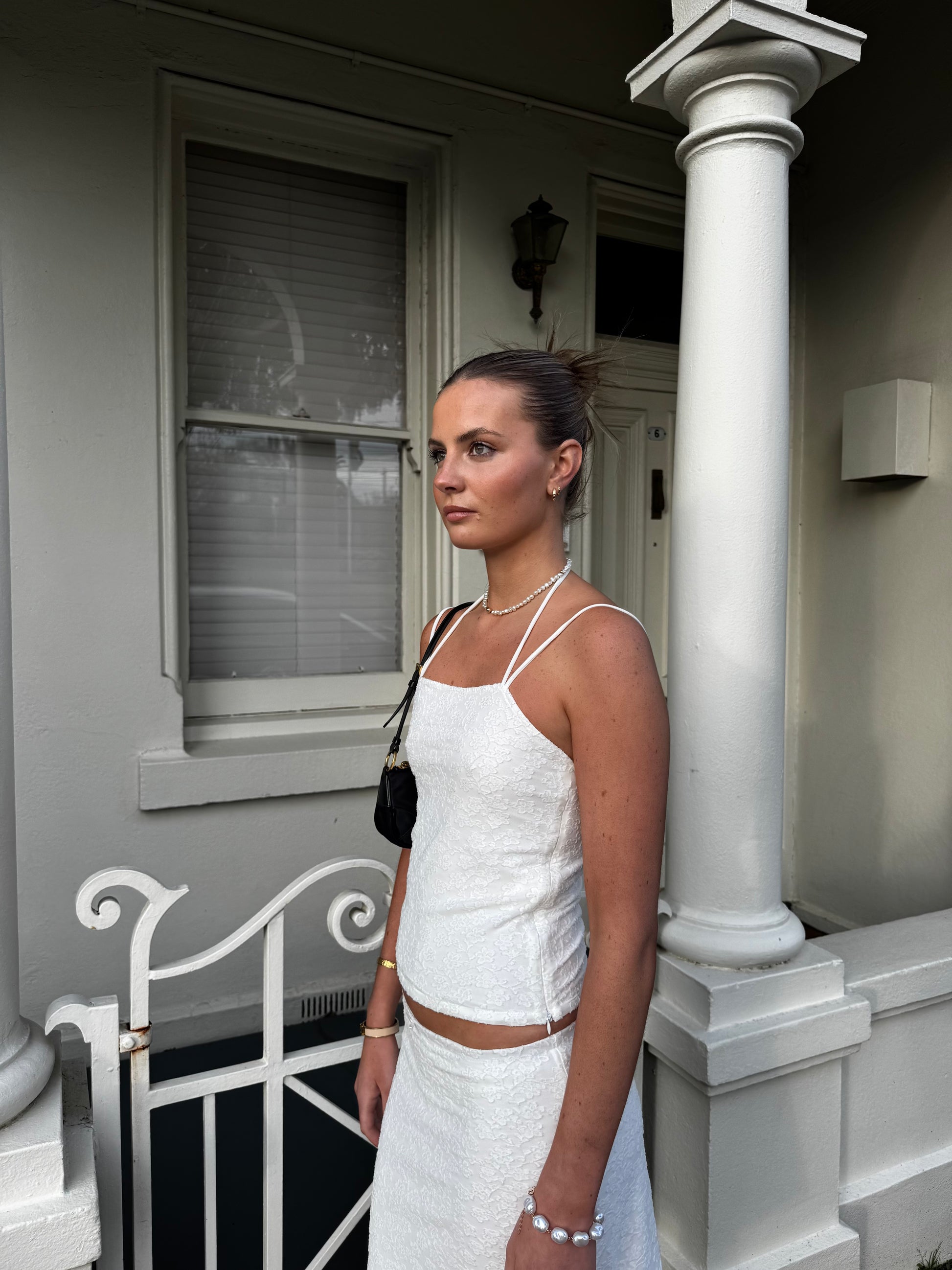 A fitted top featuring a halter tie a versatile top designed to be worn with many outfits, featuring an embossed floral pattern. Can be dressed up with the matching top or style it by itself. The set for summer and the top for all year round. A piece inspired by Venice - defined by chic, cool city girl.